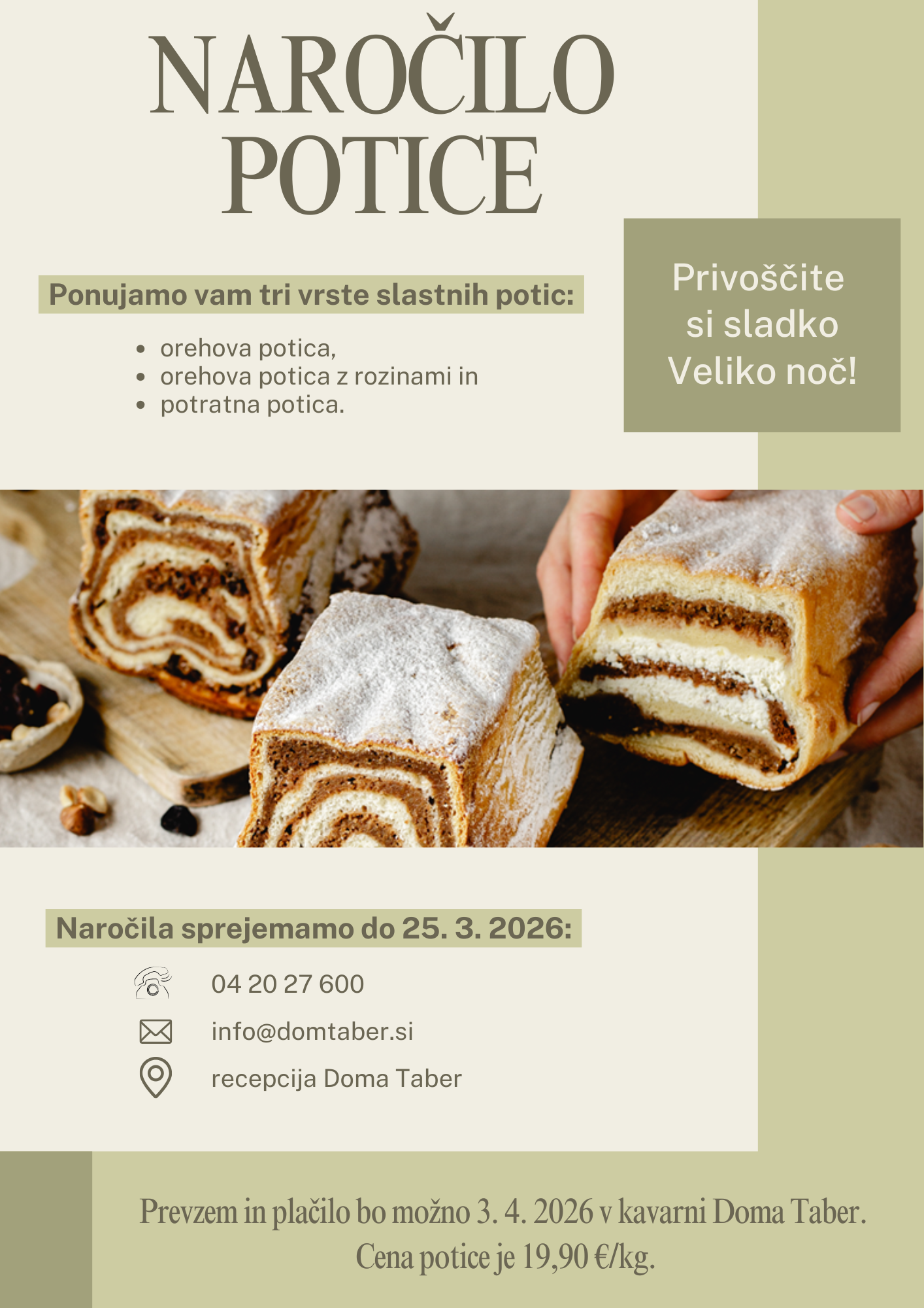 Cena potice za kos (1 kg) je 19,90 EUR z DDV. Prevzem in plačilo bo možno v petek, 3. 4. 2026, v domski kavarni.